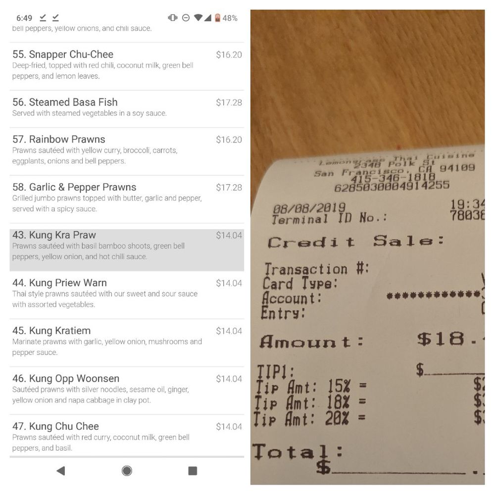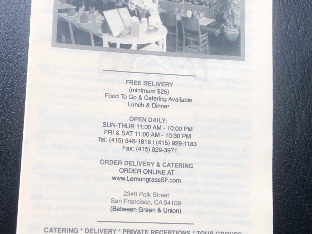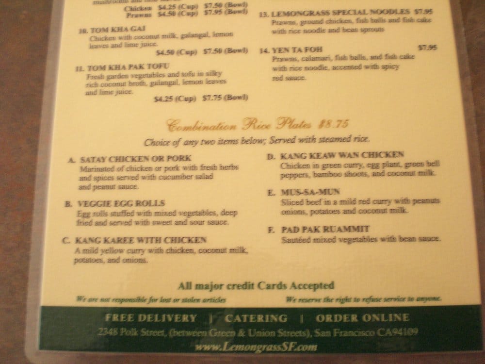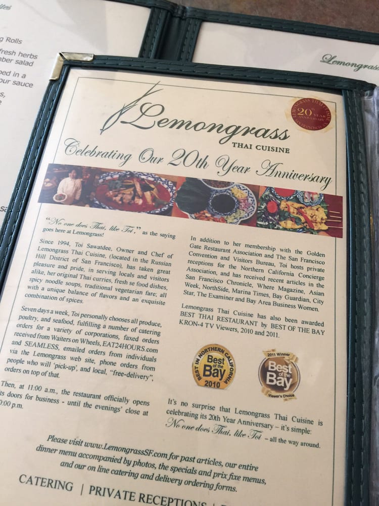 Introducing the menu at Lemon Grass Thai Cuisine, located in San Francisco, CA, this Thai restaurant offers a wide range of options for all preferences, including vegan and vegetarian dishes. Known for their flavorful dishes like Green Curry, Pad Thai, Red Duck Curry, and Mango Sticky Rice, this spot is a go-to for many locals. Customers rave about the quality of the food and the friendly service, making it a great choice for groups, kids, and even solo dining. If you're in the mood for delicious Thai cuisine in a casual setting, Lemon Grass Thai Cuisine is the place to be. Don't miss out on their signature dishes and the inviting atmosphere of this neighborhood gem.